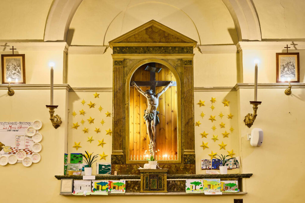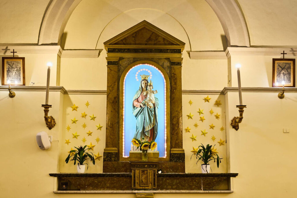 All’interno si possono riconoscere delle testimonianze artistiche di un certo prestigio e di un certo rilievo, a partire da questo crocifisso sulla destra di chi entra, del XVII secolo. Sotto il quale crocifisso, invece, è conservata una statua, come fosse all’interno di un di un sarcofago, che in realtà un sarcofago non è, una statua lignea rappresentante San Pietro Martire, molto venerato da queste parti, mentre sulla parete opposta c’è una grande statua della Madonna con il Bambino, detta la Madonna del Rosario.