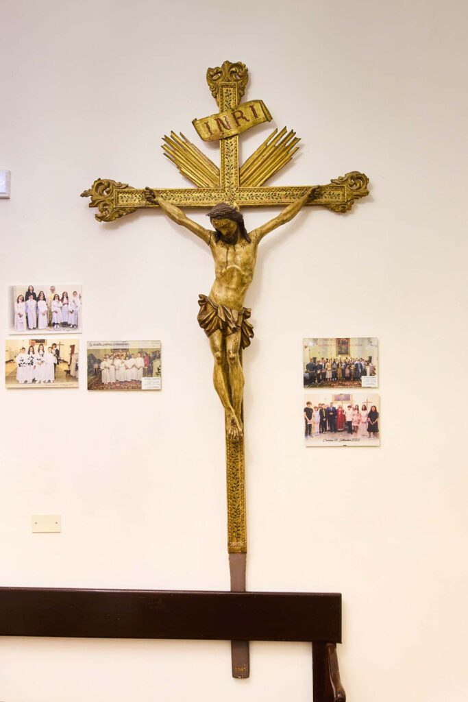 Un altro crocifisso importante e importante anche per la comunità stessa di Sant’Angelo, perché viene ogni anno portato in processione durante il Venerdì Santo, è conservato all’interno della sacrestia, sulla destra rispetto ecco, anzi, sulla sinistra rispetto alla prospettiva di chi entra all’interno di questa chiesa.