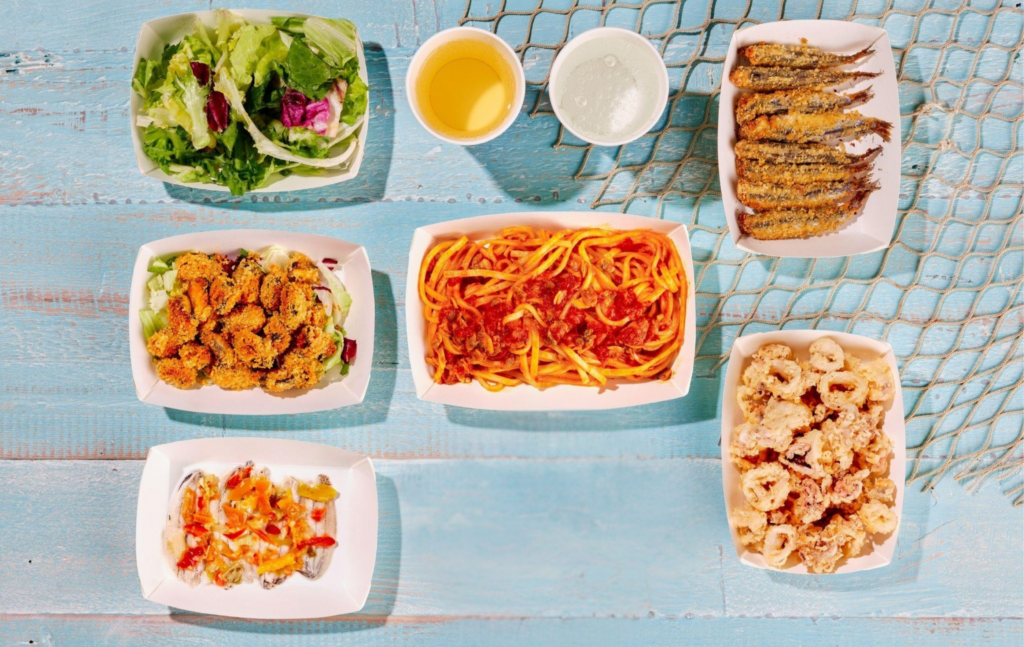 Include antipasti, primi e secondi piatti come alici, sardoncini, paste di mare e fritture, preparati con ingredienti freschi e ricette tradizionali.